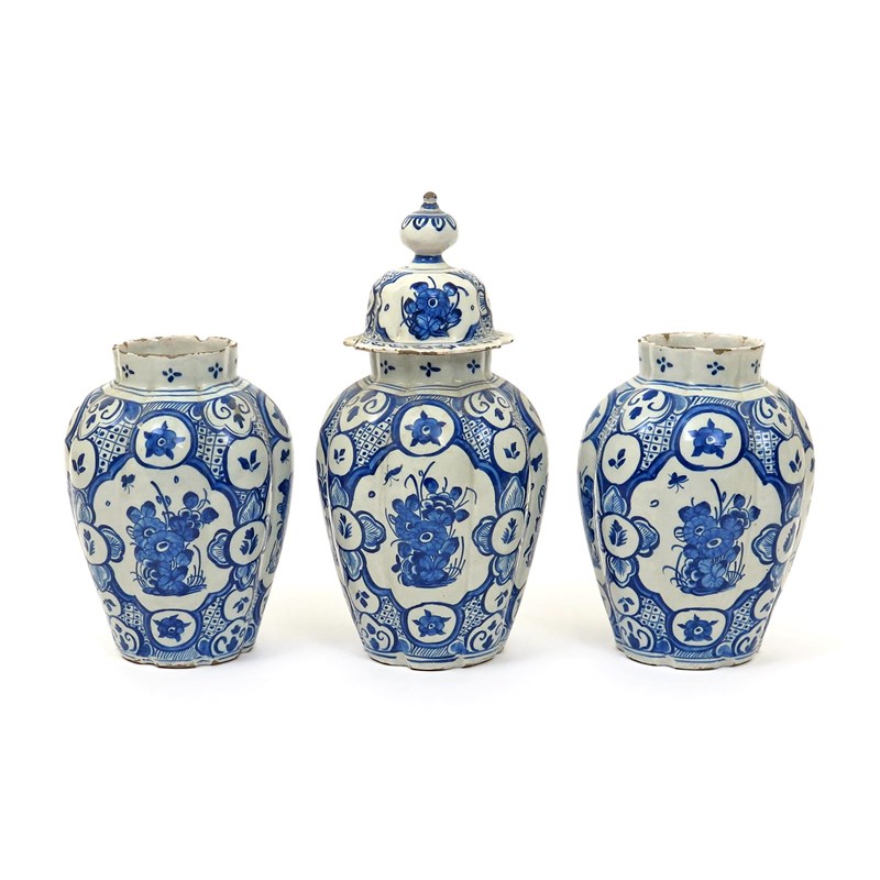 A Delft three vase garniture 18th century, the lobed forms painted in blue with panels of Oriental flowers reserved on a diaper ground, one vase with a domed cover, two covers lacking, some faults, 34.5cm max. (4)