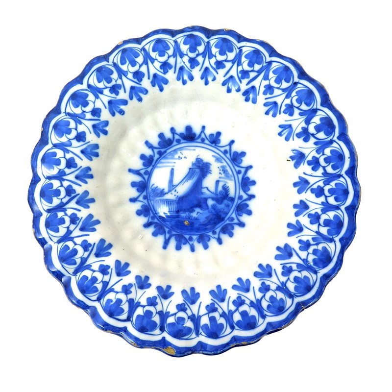 An English delftware lobed dish or cracknell c.1690, probably Brislington, the convex well painted with a small building within a jagged foliate border, moulded with two bands of gadroons, the scalloped rim with further foliate motifs and a tassel design, small faults, 33cm.
