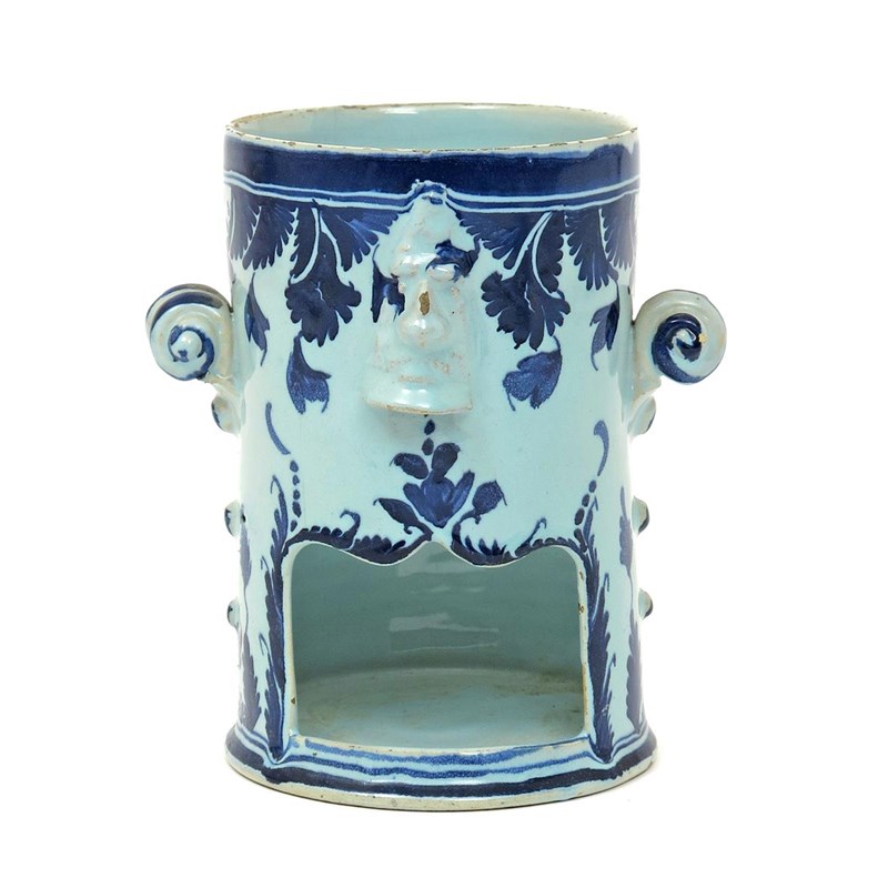 A London delftware food warmer base c.1760-80, the cylindrical form with a shaped opening beneath a moulded mask, a further mask to the reverse, the sides with scrolled handles, painted with stylized foliate motifs, blue numeral 4 mark to the base, a faint rim crack, 18cm.