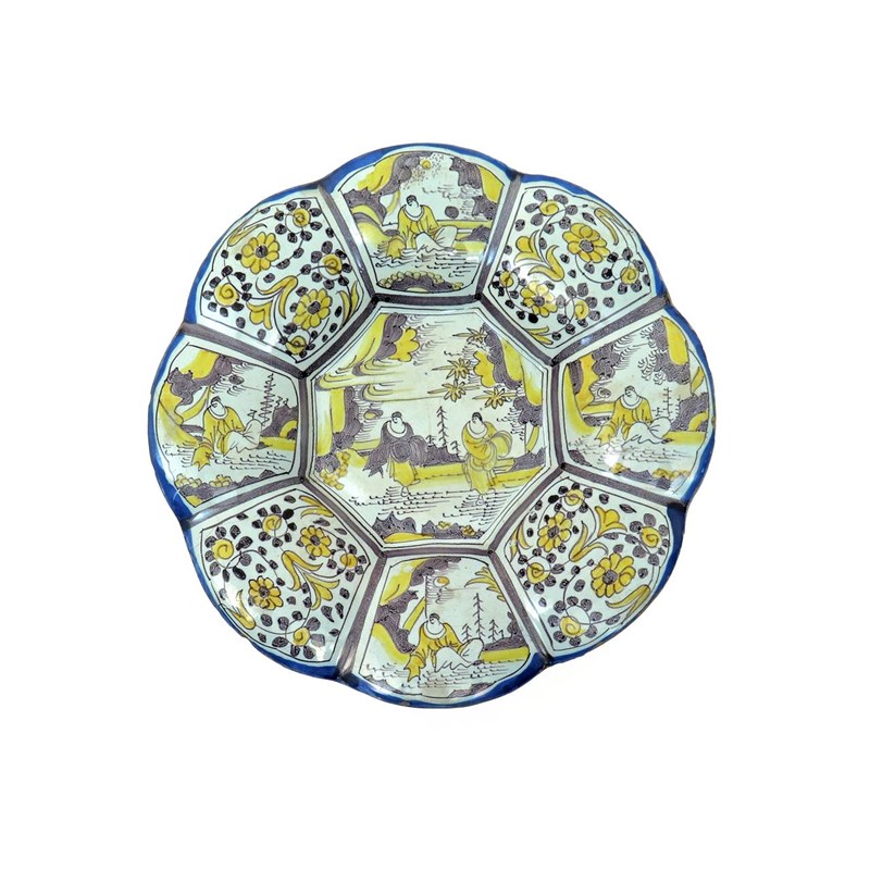 A Delft lobed dish late 17th century, the octagonal well painted in yellow and manganese with two dancing Chinese figures, the shaped rim with alternating panels of further seated figures and stylized flower sprays, blue line rim, some rim chipping, 34cm.