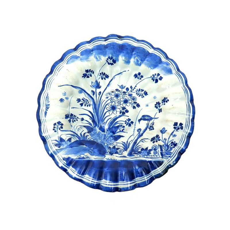 A large German faïence fluted dish 1st half 18th century, possibly Hanau, painted with a bird perched on a low branch amidst other flowering stems, some damages and restoration, 36cm.
