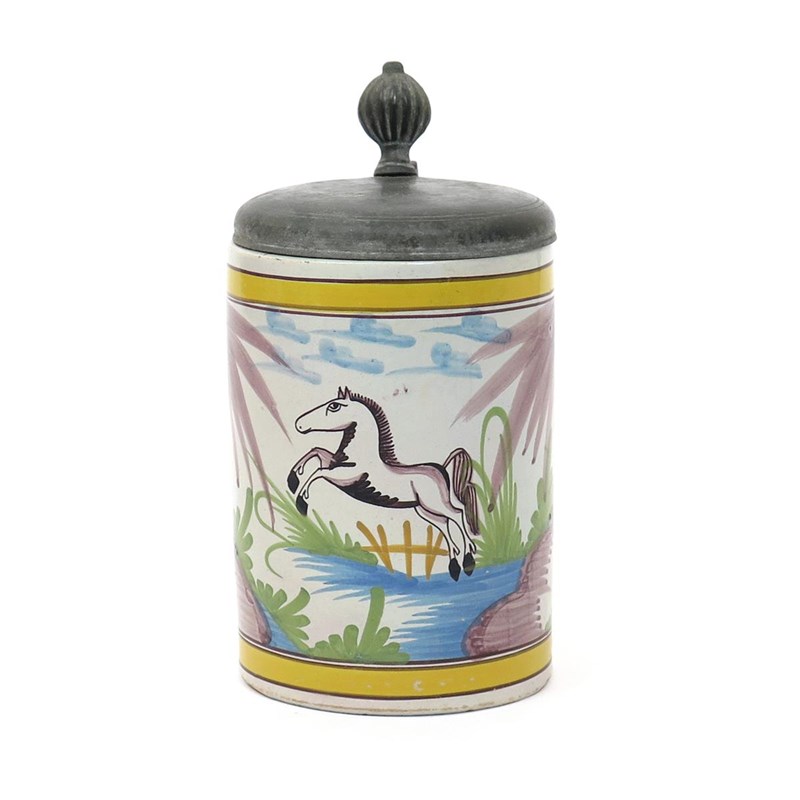 A German faïence tankard late 18th century, the cylindrical form painted with a horse jumping a fence between manganese stylized trees, the rim and foot with a bright yellow band, with a hinged pewter lid engraved with the initials WKH, 21cm.