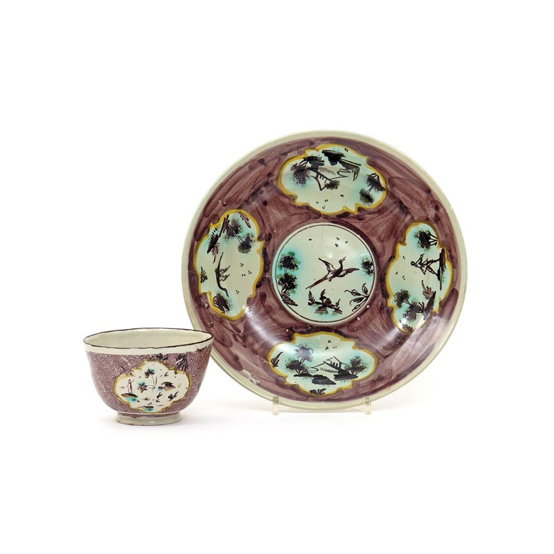 A Savona faïence plate and a sugar bowl c.1770-80, each painted with panels of figures, birds in flight and buildings in landscapes, reserved within ochre borders on a manganese ground, some restoration, 23.5cm max. (2)