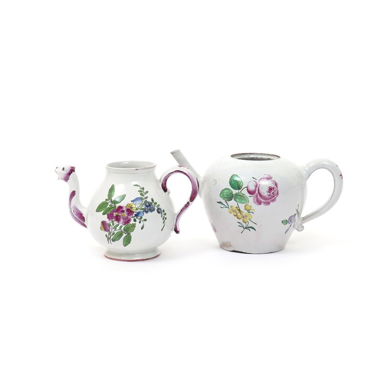 Two French faïence teapots c.1760-70, one Niderviller or Strasbourg, the pear-shaped body boldly painted with flower sprays, the spout formed as a mythical beast with puce scroll highlights, the other probably Bayreuth with a narrow straight spout and heavy handle with scroll terminal, simply painted with flowers, the covers lacking, 19cm max. (2)