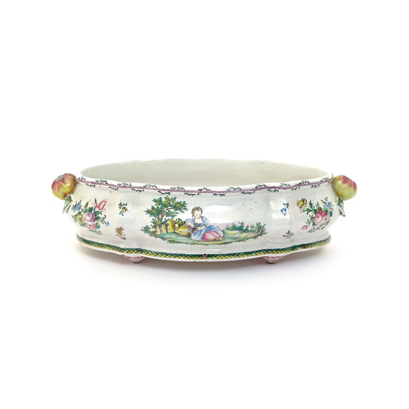 A French faïence jardinière 19th century, in the Veuve Perrin manner, the shallow shaped form painted to one side with a girl leaning against a grassy knoll, the reverse with a boy fishing by a river, within polychrome flower sprays, the handles formed as apples, gilt VP mark, 45cm across.