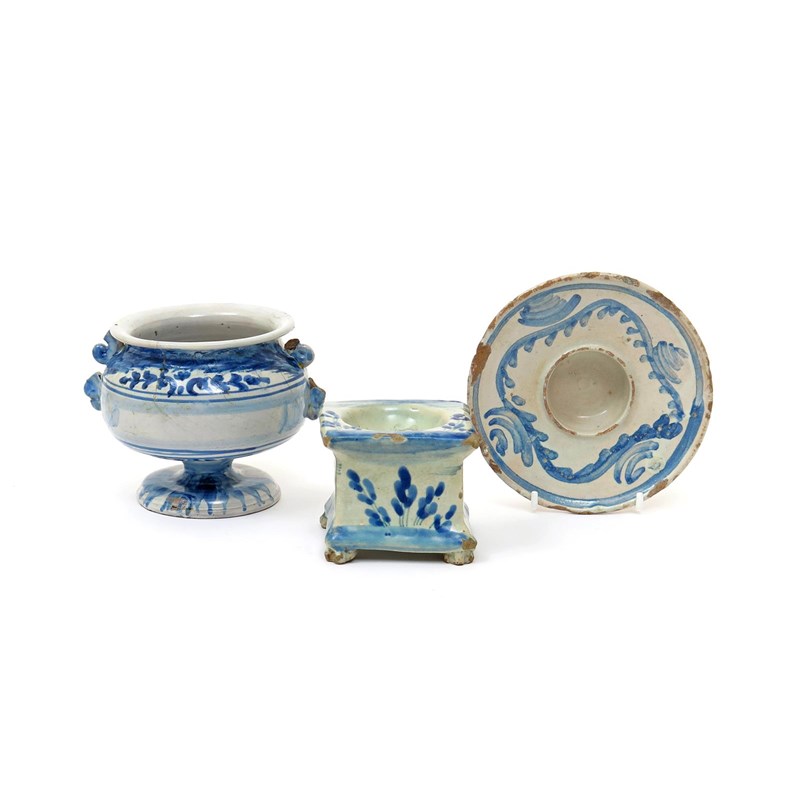 A Savona faïence two-handled vase early 18th century, painted in blue with an empty cartouche and raised on a circular foot, a Savona square salt painted with stylized flowers and raised on paw feet, and a trembleuse saucer with a blue swirl design, some damages, 13.5cm max. (3)