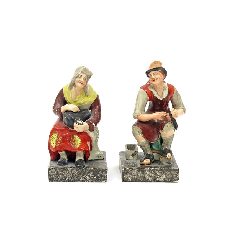 A pair of Staffordshire pearlware figures of the Cobbler and his wife c.1820, both seated, she with a jug and cup, he working on a shoe while his toes peep through his own, each on a square black base, minor faults, 16cm. (2)