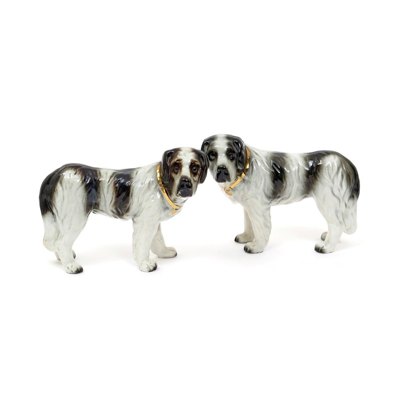 A pair of Scottish pottery models of dogs 19th century, Bo'ness Pottery (Borrowstounness) each modelled as a St Bernard, standing with heads turned and wearing gilded collars, set with glass eyes, one eye lacking, 32.5cm long. (2)