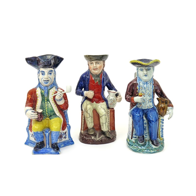 Two Delft Toby jugs 19th century, one of Squire type with a long pipe and seated on a shaped base, the other a Sailor and seated on a sea chest, red marks after Adriaenus Koeks, and a pearlware Sailor Toby jug wearing a blue coat over a red waistcoat and holding a patterned jug of ale, some faults, 30.5cm max. (3)