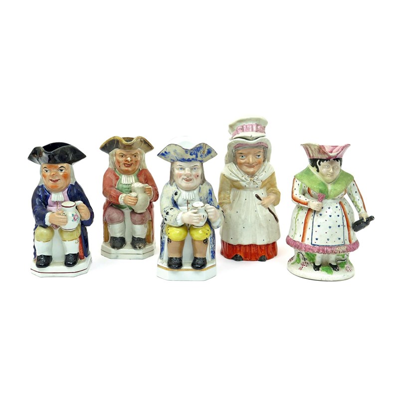 Five Toby jugs 19th/early 20th century, three of traditional form with jugs of ale, one of a Gin Woman holding a glass and bottle, the last forming a jar with a bonnet cover, of a woman with one hand in her apron pocket, some faults, 29.5cm max. (6)