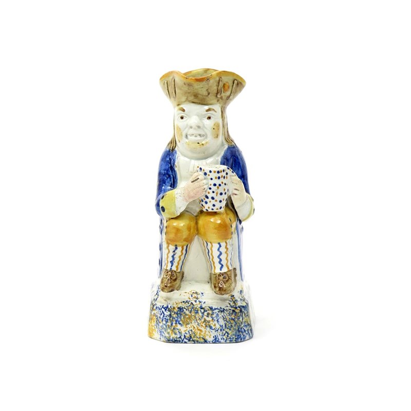 A small Pratt ware Toby jug c.1800, wearing a blue coat over yellow breeches, a spotted jug of ale on one knee, raised on a tall sponged base, a small chip to his hat, 19cm.