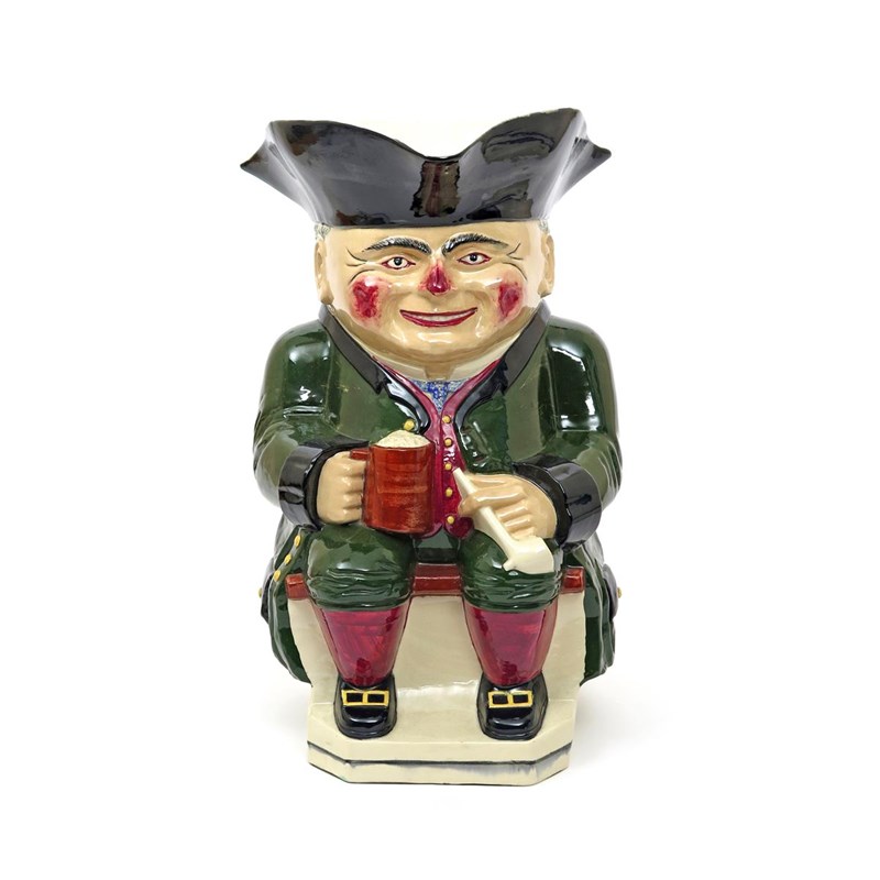 A massive Devonmoor advertising Toby jug c.1930, of usual form, seated and holding a tankard and a pipe, wearing a green coat over a claret waistcoat, with ruddy nose and cheeks, 60cm.