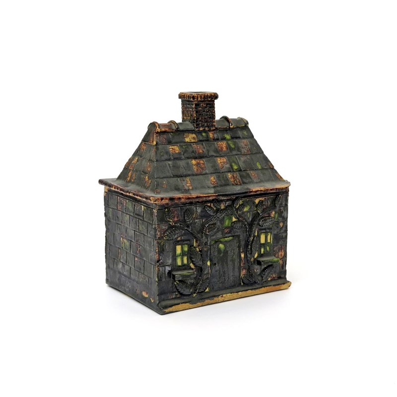 A large earthenware rectangular box and cover 19th century, modelled as a house with applied leafy branches either side of the front door, decorated in Whieldon type colours of washed green and manganese, a chip to one corner of the roof, 20cm high. (2)