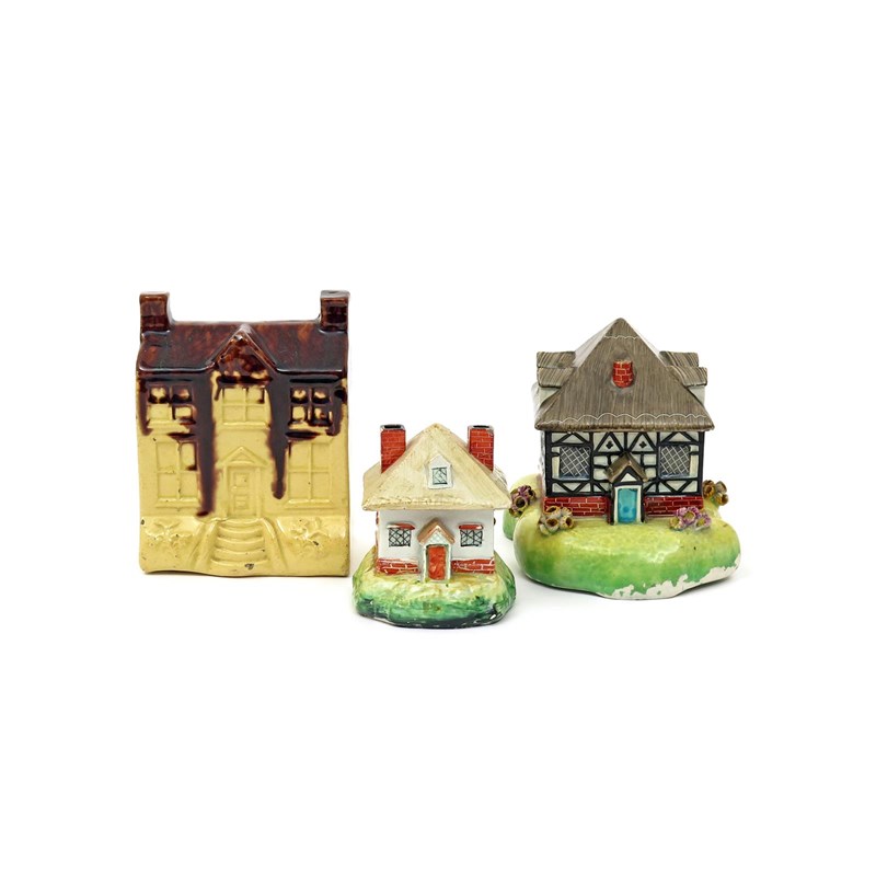 Two Staffordshire pearlware pastille burners 19th century, modelled as square cottages with thatched roofs, and a pottery moneybox modelled as a town house, some damages, 13cm max. (4)