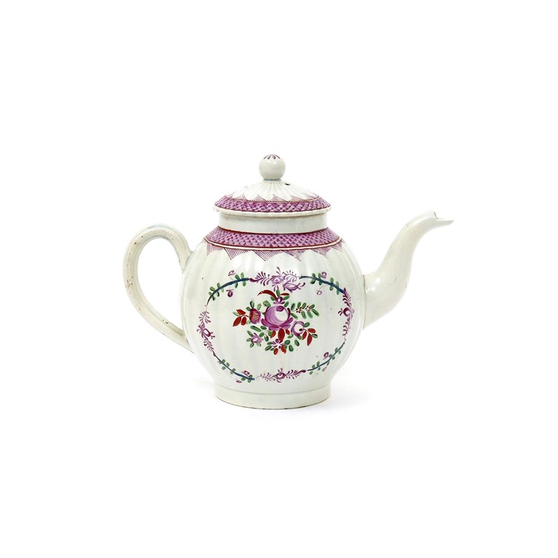 An unusual pearlware teapot and cover late 18th century, the fluted form painted in the manner of New Hall porcelain with naive rose-centred sprays, the rims with a pink diaper band, some repairs to the spout and cover, 20cm. (2)