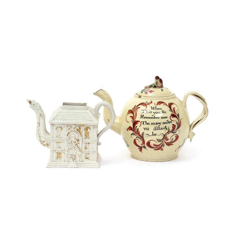 A creamware teapot and cover c.1770, the globular body inscribed 'Bohea Tea' to one side, the other with 'When this you see, remember mee, Tho many miles We distant be', and a salt-glazed stoneware teapot modelled as a three storey building, one side bearing the Royal coat of arms, with gilt detailing, some damages, the cover lacking to one, 19.5cm. (3)