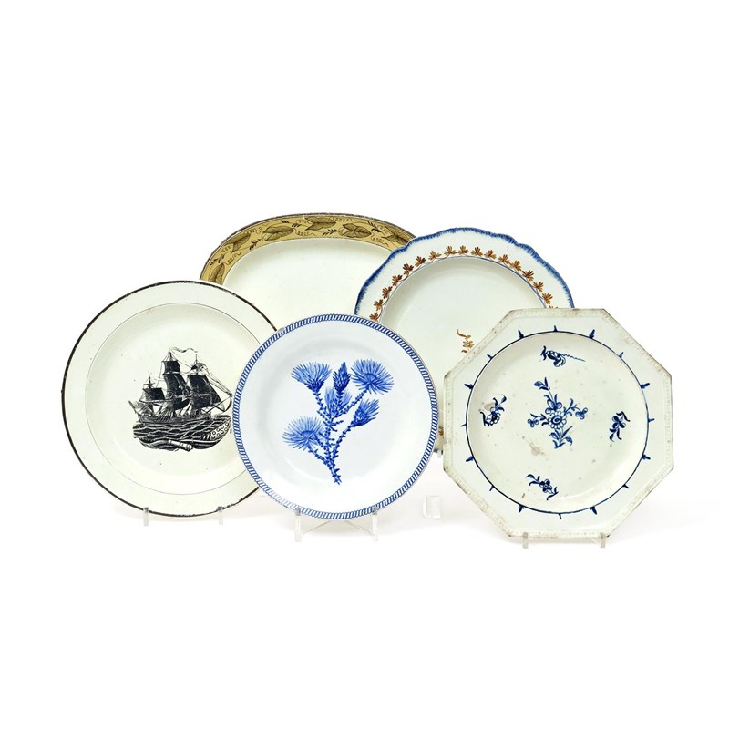 Five creamware plates late 18th/19th century, one oval Spode dish with a convolvulus leaf border, one Wedgwood and printed in blue with a botanical flower spray, one printed in black with a three-masted ship at sail, flying the American flag, one octagonal and painted with naive blue flowers, the last with a feathered rim and painted with a continuous ochre flower border, some faults, 27.5cm max. (5)