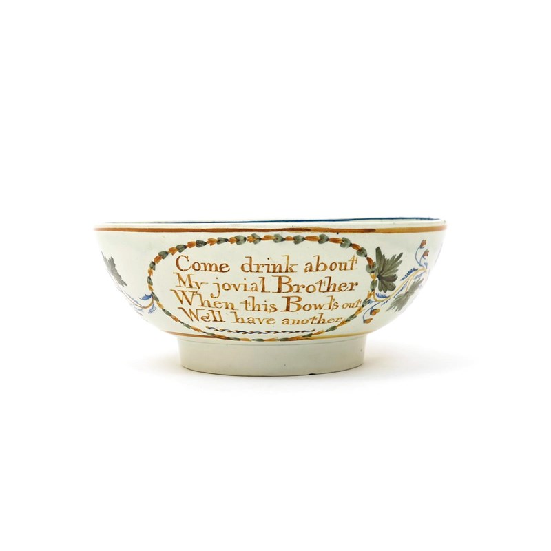 A Pratt ware punch bowl c.1800, the exterior inscribed 'Come drink about My jovial Brother, When this Bowl's out We'll have another', within a leaf cartouche joined by a continuous floral garland, the interior with willow above a low building, 26.2cm dia.