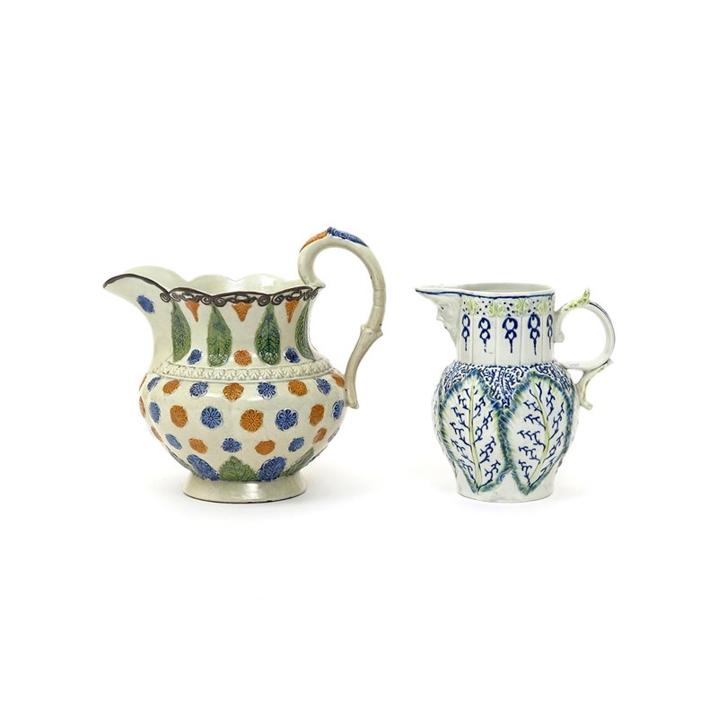 Two Pratt ware jugs late 18th/early 19th century, one of lobed form and applied with flowerhead roundels and vertical sage leaves, picked out in green, ochre and blue, the other moulded with large leaves and with a mask spout, some restoration, 18.5cm max. (2)