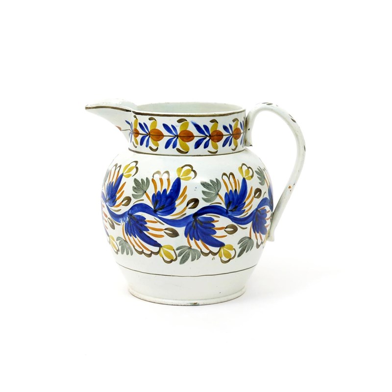 A large Pratt ware jug early 19th century, boldly decorated in a typical palette with a continuous stylized foliate band, a similar narrower band to the neck, 21cm high.