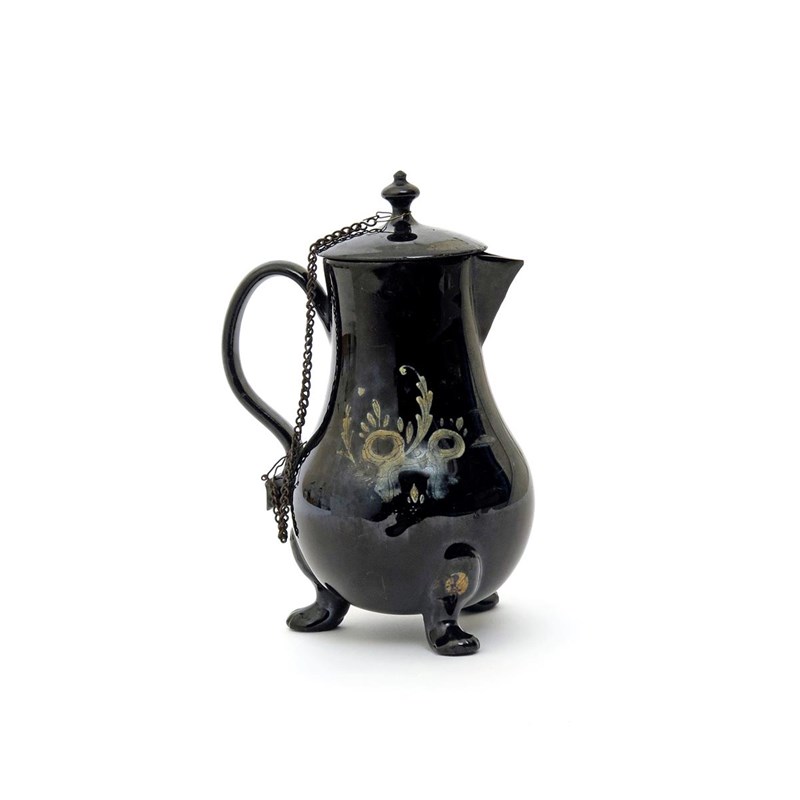 A Jackfield jug and cover 2nd half 18th century, raised on three paw feet, cold-painted with a bird in flight beside flowers, the reverse with holey rockwork, 18.5cm. (2)