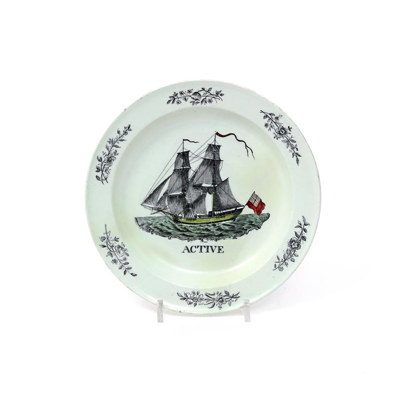 A Liverpool-printed creamware plate of shipping interest c.1790, printed in black by Sadler and Green with a two-masted ship at sale, with coloured enamel highlights, titled 'Active' beneath, the rim with size flower sprays, restored, 20.8cm.