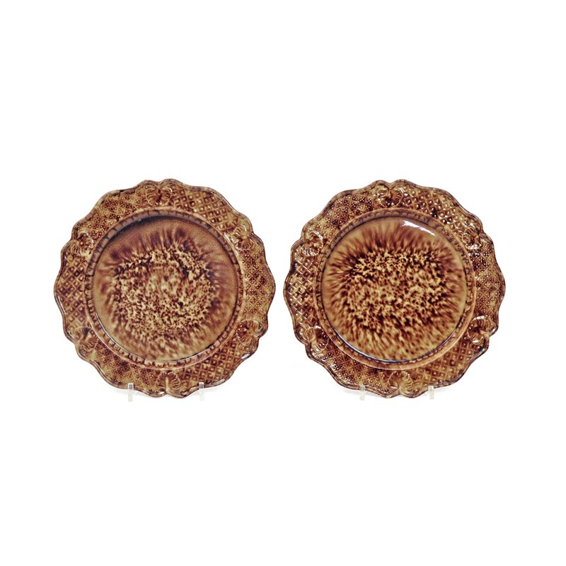 A pair of creamware plates c.1770, the shaped rims moulded with panels of hatched diaper between leaf scrolls, decorated in the Whieldon manner with a manganese wash, 23.7cm. (2)