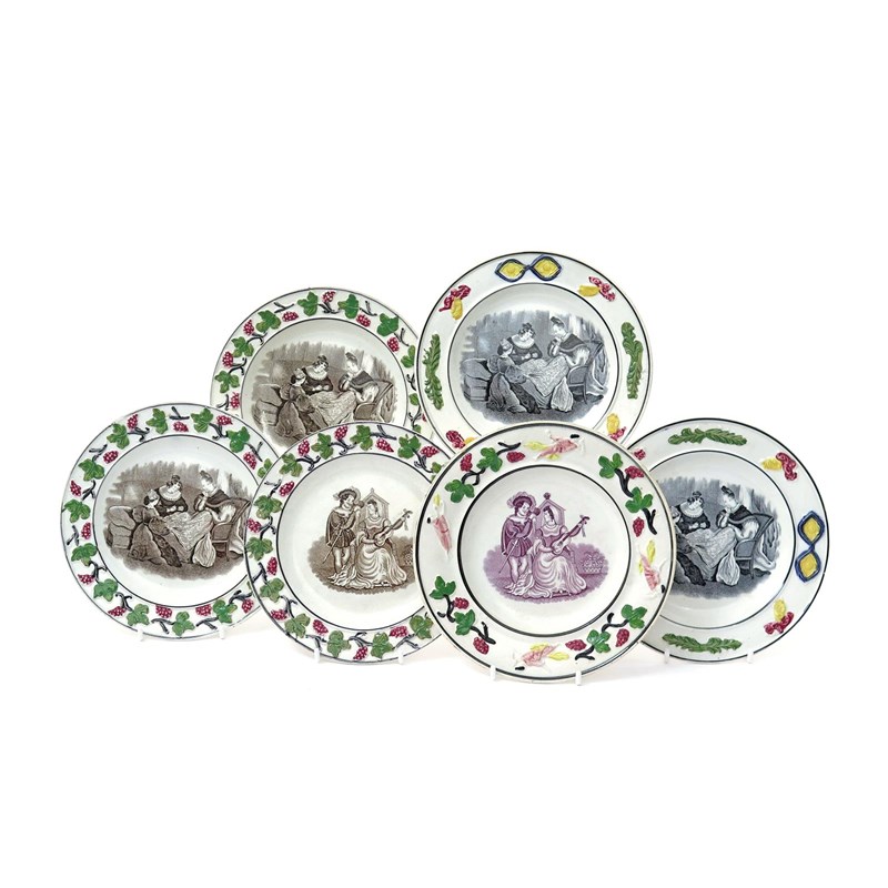 Six Dawson & Co. pearlware nursery plates c.1830, printed with ladies having their fortune told, or with a young Queen Victoria playing to Prince Albert, the rims moulded with grapevine or small motifs and hand coloured, impressed and printed marks, 17.7cm max. (6)