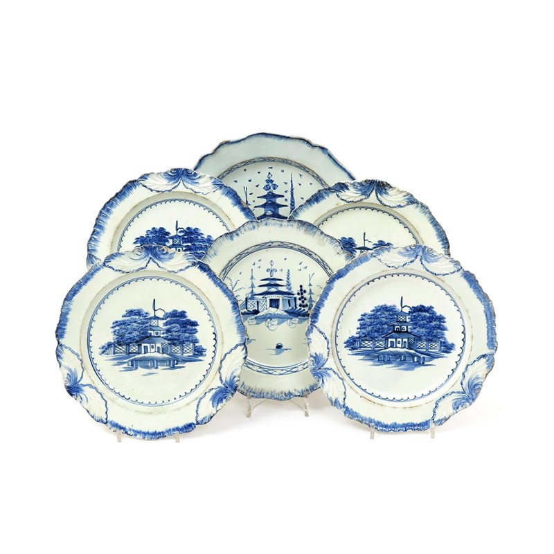 Six pearlware plates late 18th century, painted in blue with tall pagodas flanked by trees and an ornamental fence, four of the plates moulded with six leaves to the rim, some damages, 29.3cm. (6)