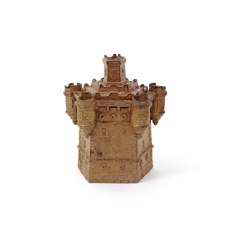 An unusual brown stoneware jar and cover 19th century, of pentagonal form, modelled as a castle tower with five turrets to the rim and a central turret to the cover, the rim pierced with further small holes, damages, 23cm. (2)