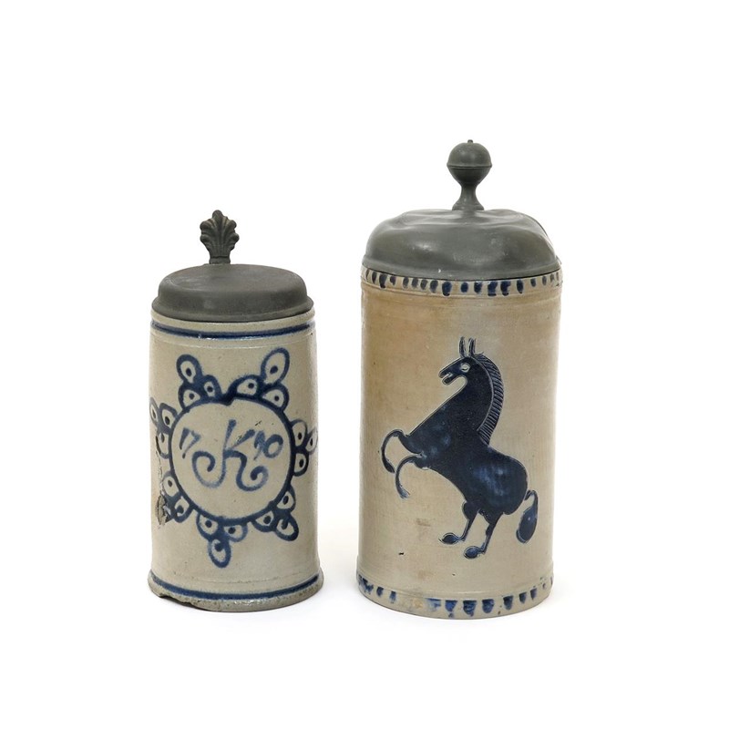 Two Westerwald stoneware tankards 18th century, of cylindrical form, one incised with a rearing horse filled with blue glaze, the other painted with a stylized floral roundel containing the letter K and the date 1710, mounted with hinged pewter covers, 26.5cm max. (2)