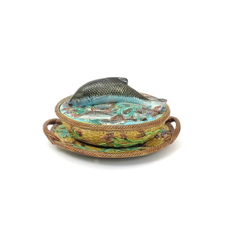A George Jones Majolica sardine dish with cover and stand c.1876, the oval form applied with seaweed fronds over basket moulding, the cover with a fish finial over sardines laid end to end, impressed mark and applied registration diamond, a small chip to the fish's tail, 23.5cm. (3)