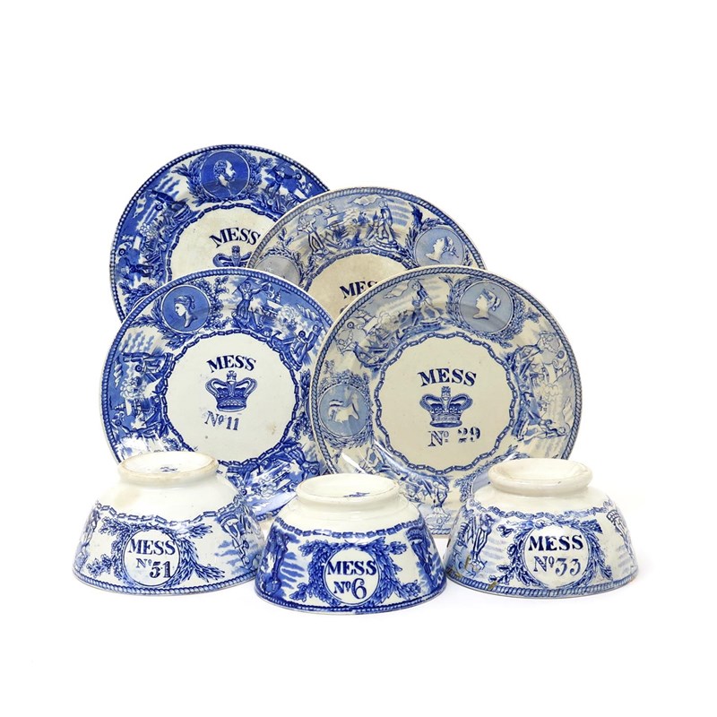 Four transferware Royal Navy Mess plates and three bowls late 19th/early 20th century, printed for Mess numbers 6, 8, 11, 29, 33, 44 and 51, most with portraits of Queen Victoria, one plate and bowl with King Edward, flanked by scenes of sailors waving pennants, various marks, some damages, and repairs, 24cm. (7)