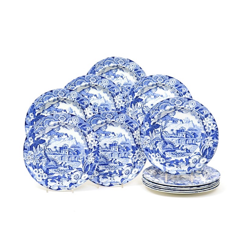 A set of twelve Don Pottery transferware plates c.1830, printed with figures at rest before a walled palace, the rims with two putti amidst large flowers and leaves, 23.5cm. (12)