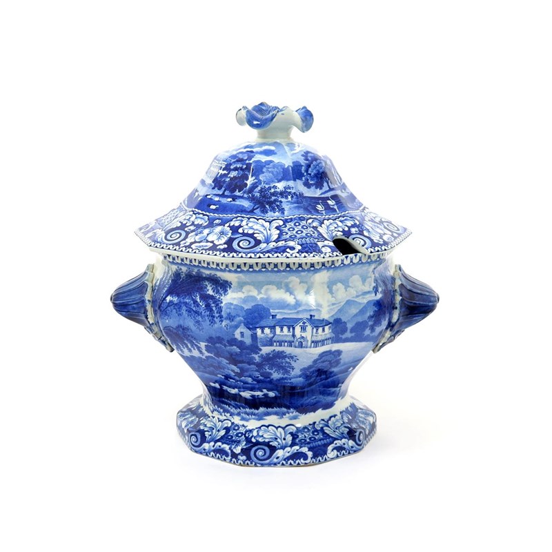 A large blue and white transferware soup tureen and cover 19th century, by John and Richard Riley, the octagonal form printed with a view of Gracefield House in Queen's County, Ireland, after the engraving by Robert Wallis, within a floral and scroll border, printed mark, minor faults, 34cm. (2)