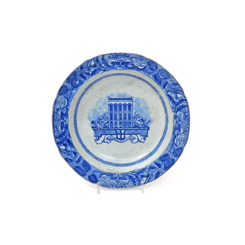 A blue and white transferware soup bowl 19th century, printed with the arms of the City of London, a shield quartered by the cross of St George, containing the sword of St Paul, above a banner titled 'Domine Dirige Nos', the border with crowns and the flowers of the Union, 23.2cm.