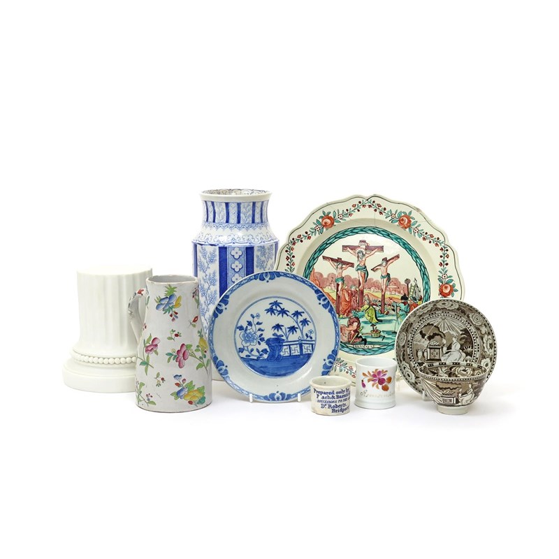 A mixed lot of ceramics most 19th century, including a Mason's stone china jug with floral decoration, a large stone china vase with printed blue panelled decoration, a Parian ware fluted socle, a Dutch-decorated creamware plate, a small Turner's stone china plate painted with a Chinese garden, a pearlware teabowl and saucer, a pearlware ointment pot, and a Continental souvenir tankard, some faults, 24cm max. (9)