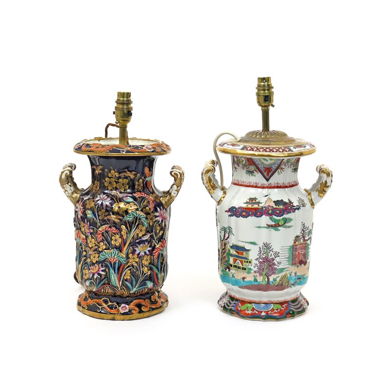 Two Mason's two-handled vases 19th century, mounted as lamps, one printed and coloured with a Chinese pagoda landscape to one side, the reverse with aquatic birds swimming beneath tall lotus plants, the other with moulded and applied decoration of birds, butterflies and flowers reserved on a mazarin blue ground with further gilded flower stems, some faults, 39cm overall. (2)