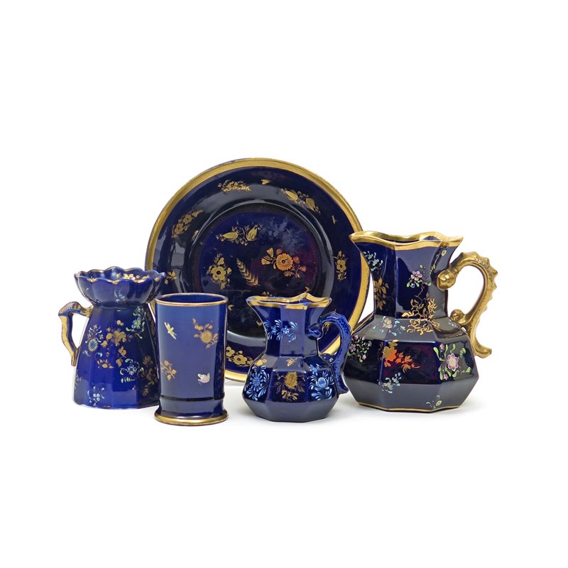 Three Mason's Ironstone jugs 19th century, two of octagonal form with kylin handles, the last of tapered faceted form, all variously enamelled and gilded with flower sprays on a deep mazarin blue ground, together with a similarly decorated spill vase, and a deep plate with scattered gilt flowers, impressed circular mark to the faceted jug, 23cm max. (5)