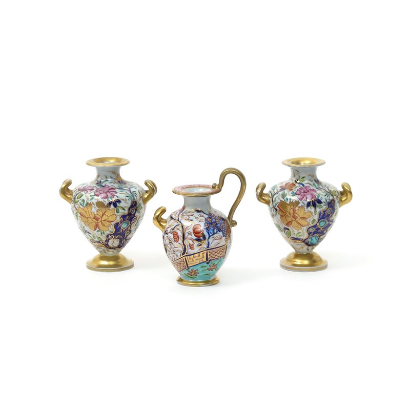 A pair of C J Mason Ironstone two-handled vases c.1820, the ovoid bodies painted in the Oriental manner with flowering branches issuing from holey rockwork, and a miniature ewer with high handle, decorated in the Imari palette with oriental plants behind an ornamental fence, some restoration, 11cm max. (3)
