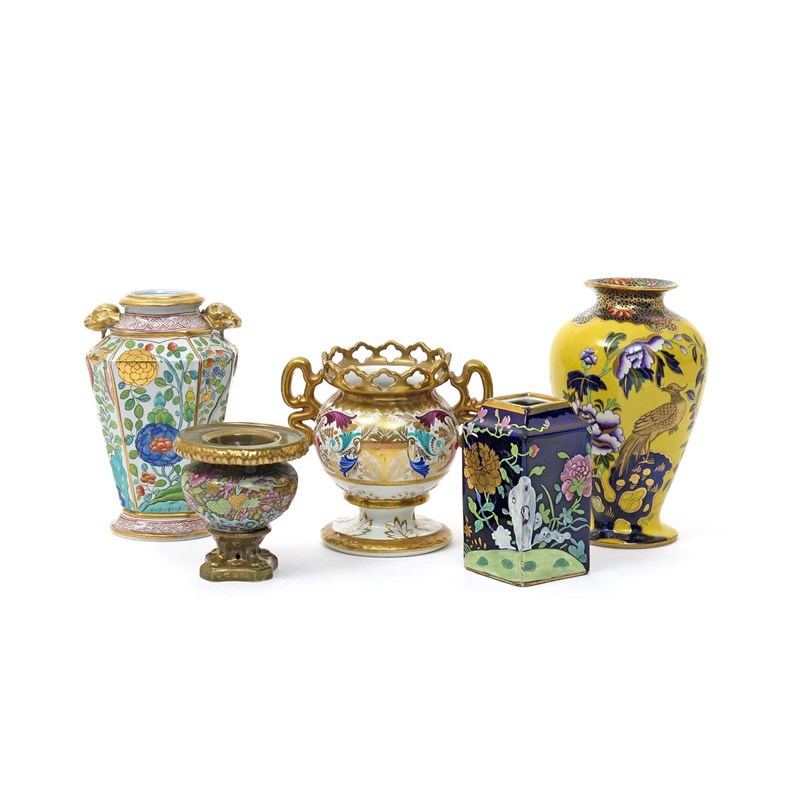 Four Mason's Ironstone vases 19th century, one C J Mason of octagonal form with rosebud handles, painted in the famille verte palette with flowering branches, another with elaborate gilt scroll handles, painted and gilded with formal foliate scrolls, one of censer shape and enamelled with birds and flowers on a drab green ground, the last Ashworth's and decorated with long-tailed birds on a bright yellow ground, and a Mason's tea canister, enamelled and gilded with chrysanthemum on a mazarin blue ground, various marks, some faults, covers lacking, 21.3cm max. (5)