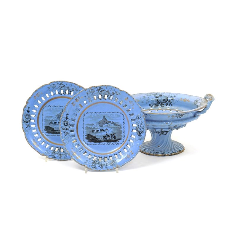 A James Keeling comport and two plates c.1830, printed in black with views of Birs Nimroud from Buckingham's 'Travels in Mesopotamia', reserved on a blue ground with floral sprays to the pierced rims, 29cm max. (3)