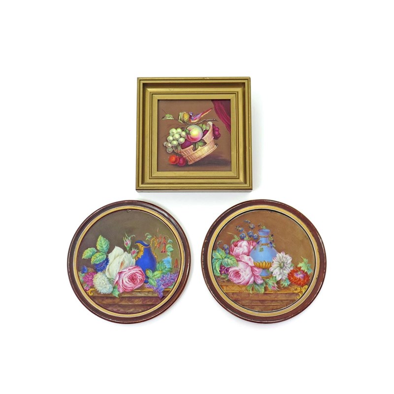 A pair of porcelain circular plaques 19th century, painted with ewers amidst large rose, lilac and dahlia flowers, resting on decorative table tops, and an English porcelain square plaque painted with a colourful bird alighted on a fruiting branch on a tilted basket filled with grapes and other fruits, in a later giltwood frame, 13.3cm max. (3)