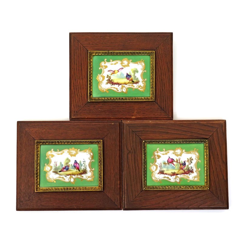 Three Paris porcelain rectangular plaques 19th century, probably London-decorated with colourful birds perched and in flight by low branches, reserved within gilt C scrolls on an apple green ground, framed, one corner broken off and cleanly restuck, each plaque 7.5cm x 10cm. (3)