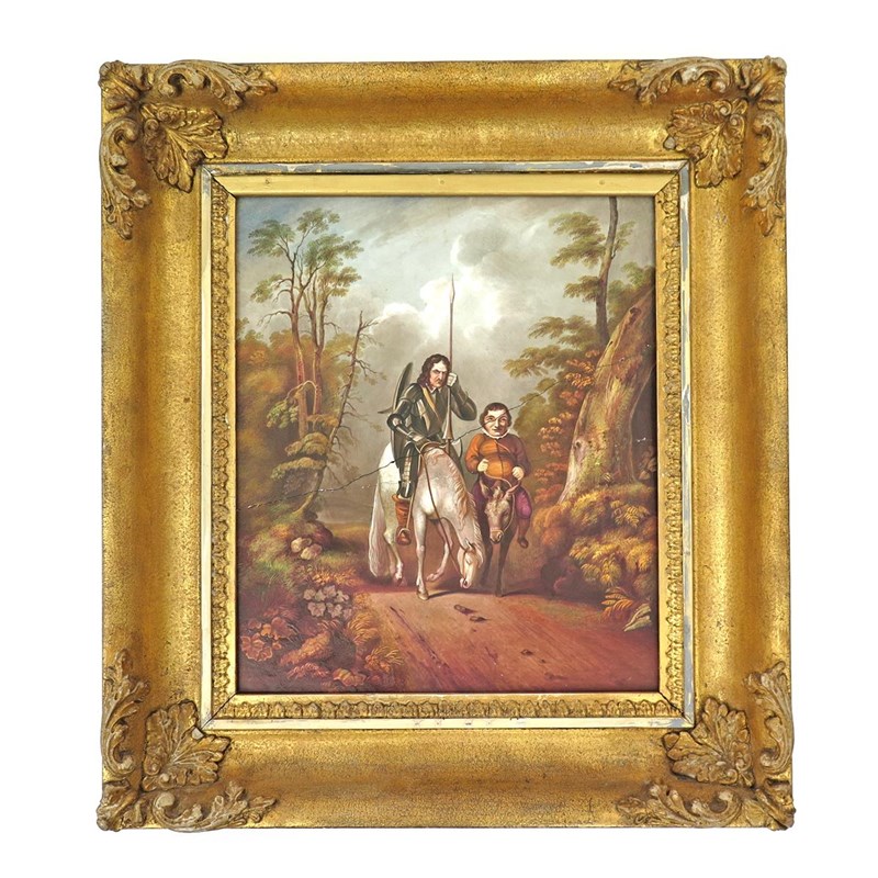 An English porcelain rectangular plaque mid 19th century, attributed to John Wager Brameld at Rockingham, painted with a scene from Cervantes' novel, with Don Quixote and Sancho Panza on horseback between trees, in a gilt wood frame, broken and restuck, the plaque 33.5cm high.