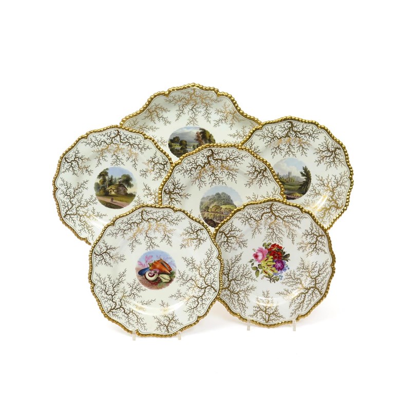 Five Flight Barr and Barr dessert plates c.1820, and a shaped dessert dish, three plates and the dish painted with topographical views, one plate with an arrangement of sea shells, one with flower painting attributed to William Billingsley, all reserved on a ground of gilt seaweed tendrils, impressed and printed marks, 30cm max. (6)
