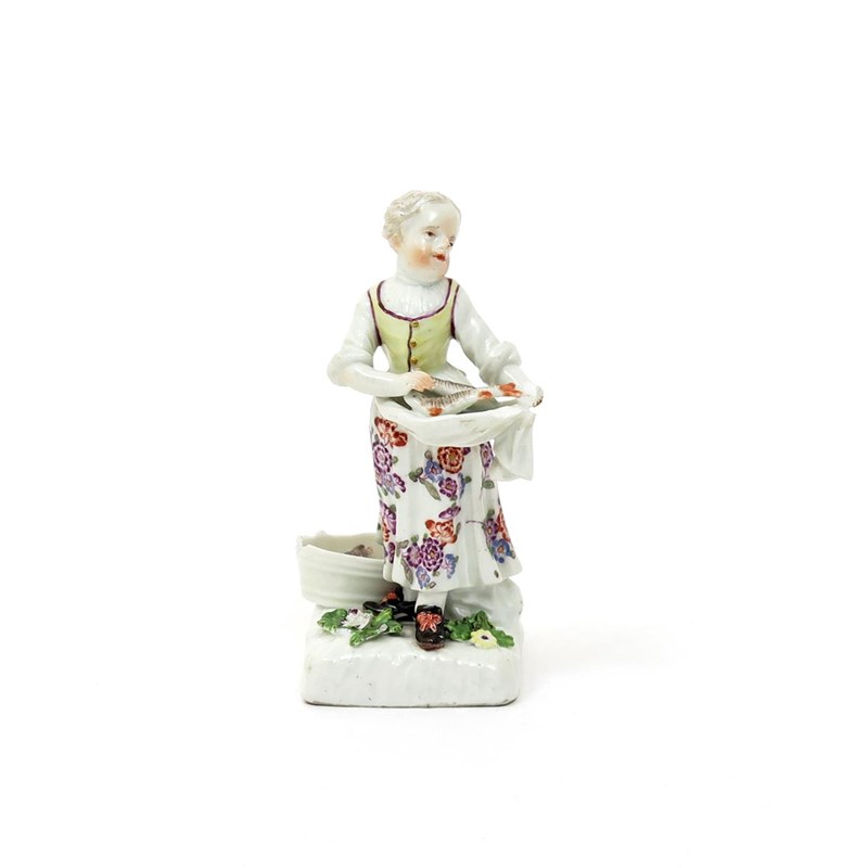 A Meissen figure of fish seller c.1745, modelled as a young girl, with two fish held in her apron, with more of her catch in a tub behind her, raised on a square base applied with flowers, blue crossed swords mark, some chipping, 11.5cm.