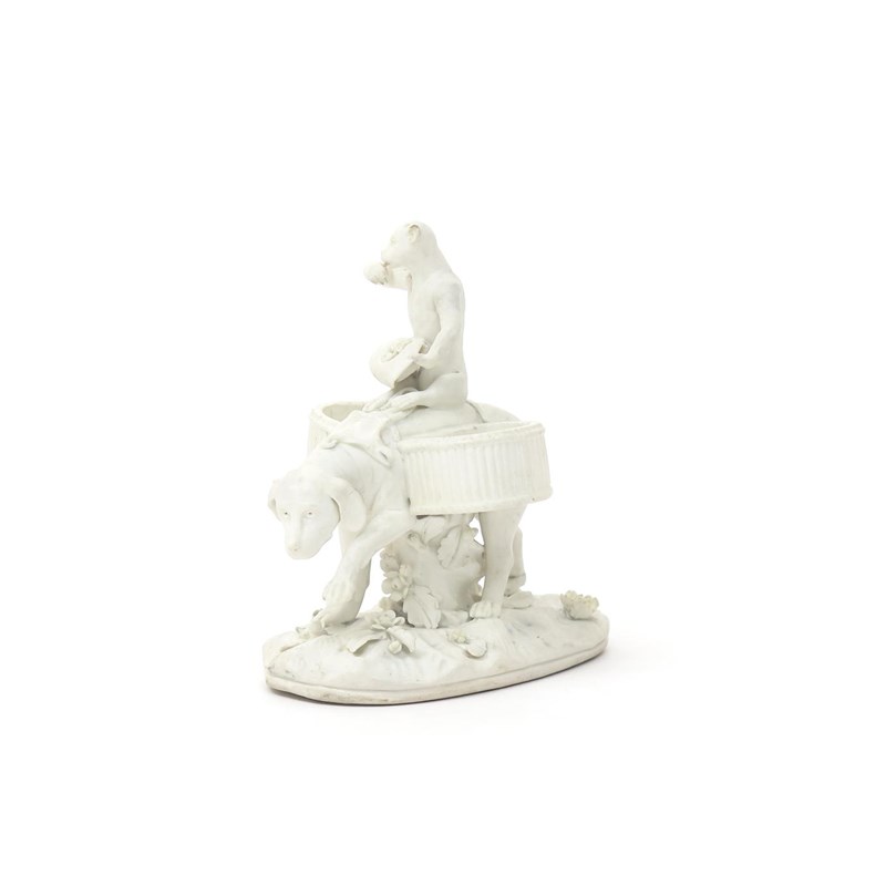 A French biscuit porcelain sweetmeat figure late 18th century, modelled as a monkey riding on the back of a large dog with empty panniers strapped to his back, the monkey eating fruit from an upturned hat, raised on an oval base applied with flowers, 12cm high.