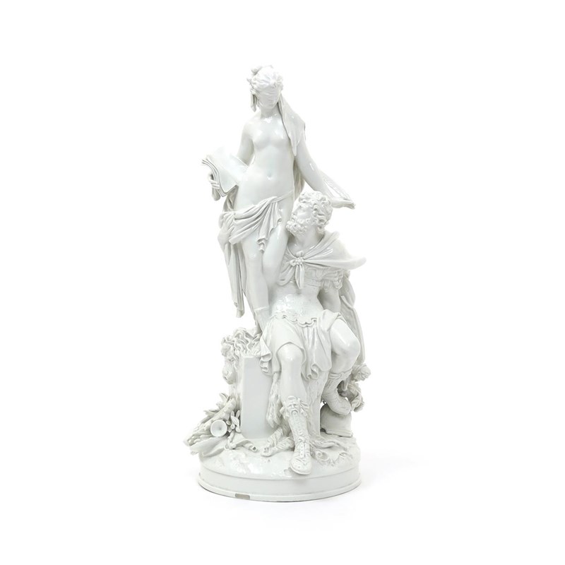 A large Berlin figure group of Mars and History late 18th/early 19th century, modelled by W C Meyer, Mars seated on a square block draped with a lion skin, holding his shield behind him, History standing above him holding a book and feather quill, Mars with his right arm around her hips, left in the white, raised on a circular base, blue sceptre mark, 47cm.