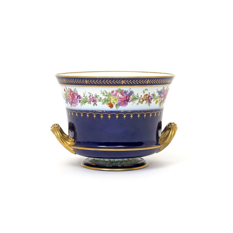 A large Sèvres-style two-handled jardinière 19th century, well painted with a continuous garland of flowers reserved on a dark blue ground, raised on a low circular foot, overglaze mark of 'Sevres y', two rim cracks, 18cm.